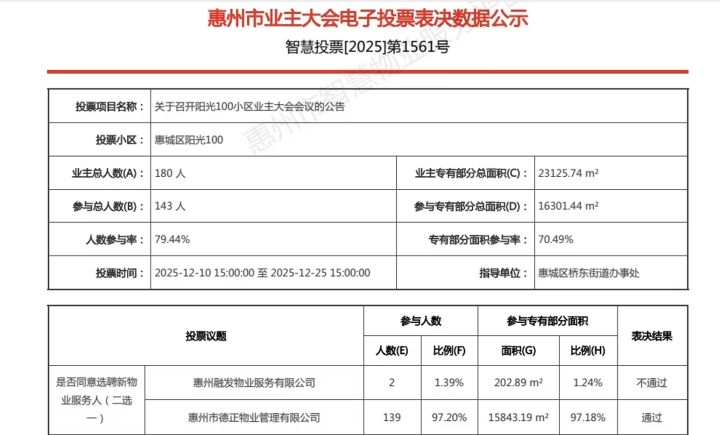 近期,惠城区桥东街说念东平阳光100小区业主肖先生向南齐“小N立时办”投诉,2025年12月10日至25日,小区业主通过惠州市智谋物业服务平台业主有蓄意电子投票系统召开业主大会,在桥东街说念办、居委会的照章监督下,按法定方法选聘惠州德正物业不停有限公司为小区新物业。