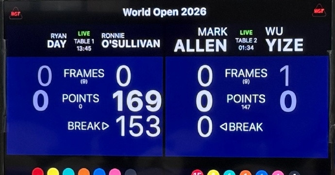 第一局奥沙利文单杆打出疏远的153分。 由于瑞恩·戴违章,奥沙利文这局打了16套红球加彩球,14套红球与黑球,2套红球与粉球。