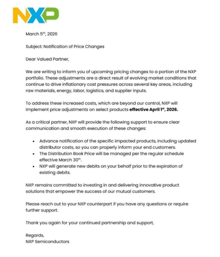 各人模拟芯片大厂恩智浦近日也发布了加价函,官宣自2026年4月1日起对部分产物调价。这次调价系受原材料、动力等多法度资本上升影响,同期将提供多项扶持保险调价顺畅履行。