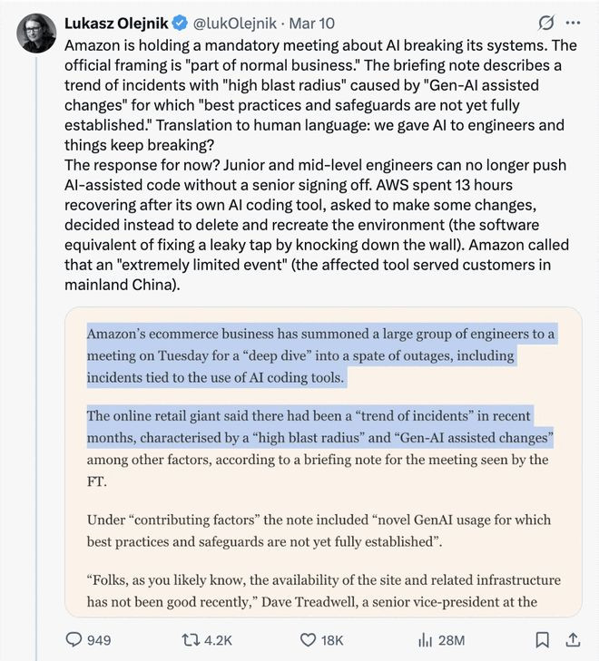 ·AI成了诱发要素:简报明确指出,夙昔几个月的故障呈现出一种趋势性,而其中的中枢变量恰是“生成式AI补助下的代码变更”。