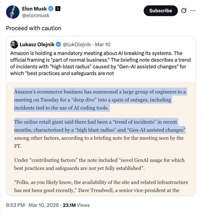 亚马逊被自家AI写的烂代码搞瘫痪,马斯克立马奉上一句书不宣意的神补刀。