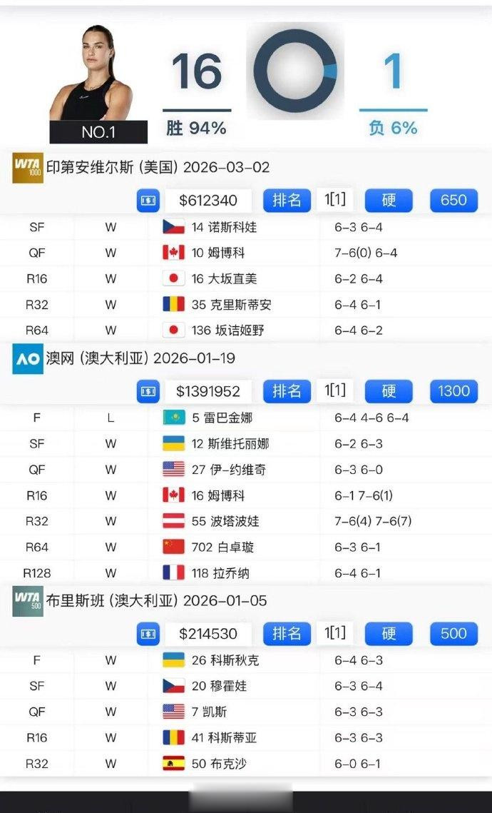 此役事后,银河国际游戏平台官网M6体育app萨巴伦卡在本年的收获来到了16胜1负。在萨巴伦卡告捷的16场比赛中,一说念直落两盘取胜。