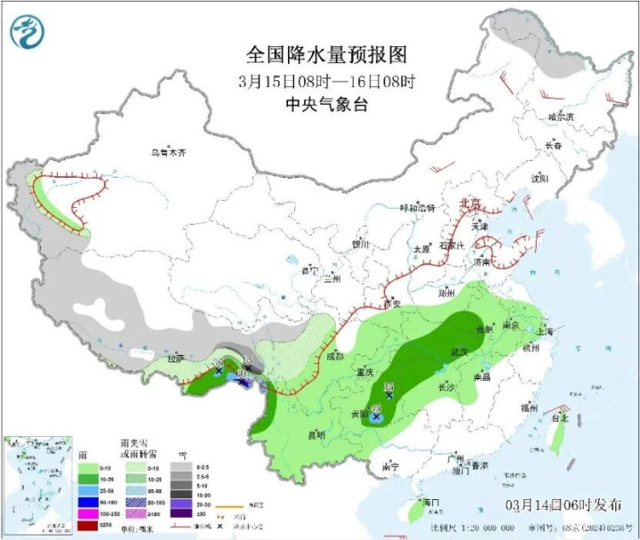 中央表象台预测,翌日,内蒙古东北部、黑龙江西北部、新疆南疆盆地和西部山区、西藏东部和西南部、川西高原北部等地部分地区有小到中雪或雨夹雪,其中,西藏东部部分地区有大雪,局地暴雪。西藏东南部、云南西北部、河南南部、安徽西部、湖北大部、湖南北部、贵州中东部等地部分地区有中到大雨,其中,西藏东南部等地局部地区有暴雨。