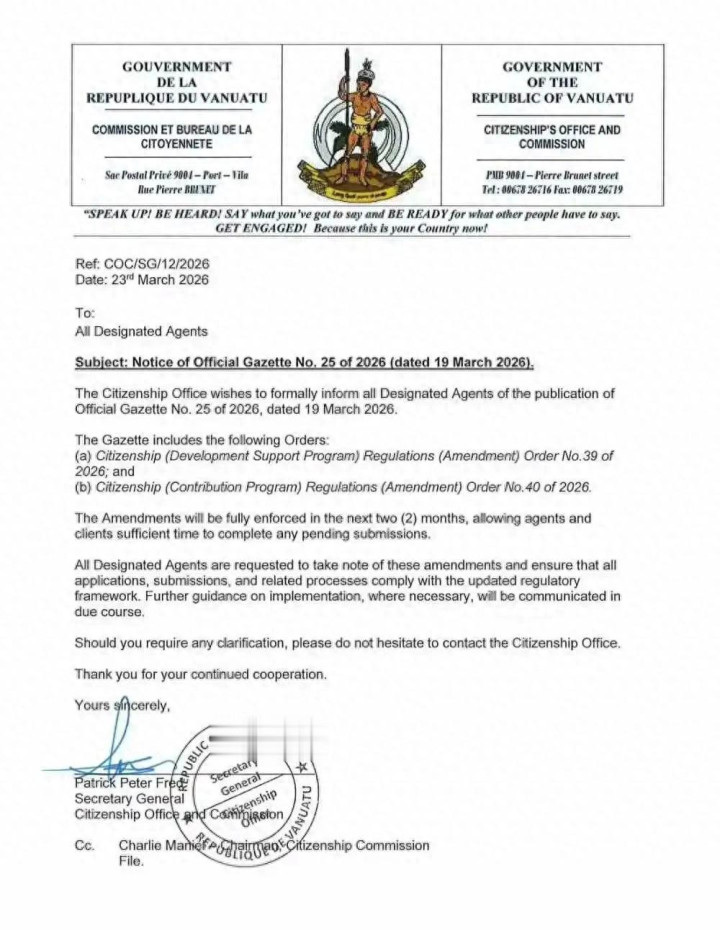 本次调价为瓦努阿图政府对投资入籍项观点官方校正,并非临时波动,波及两项要津法案:《公民身份(发展复古筹办)条例(校正)令2026年第39号》与《公民身份(孝敬筹办)条例(校正)令2026年第40号》。公告明确,校正将在2个月内全面收效,过渡期摈弃后总共新苦求均按新法式缴费,无例外。