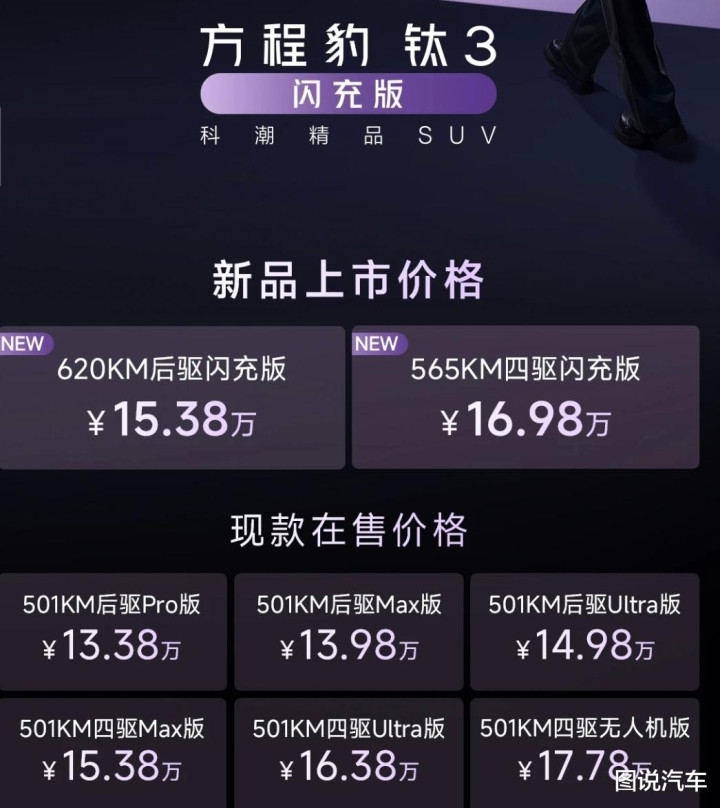 说完iCAR V27,再来看方程豹的钛3,闪充版原本了!闪充版块有两个,一个620公里后驱纯电售价15.38万,一个是565公里纯电四驱16.98万,有莫得发现一个神奇的相同点,16.98万的钛3,可以买到i CAR V27的初学版?淌若是你你会选谁?