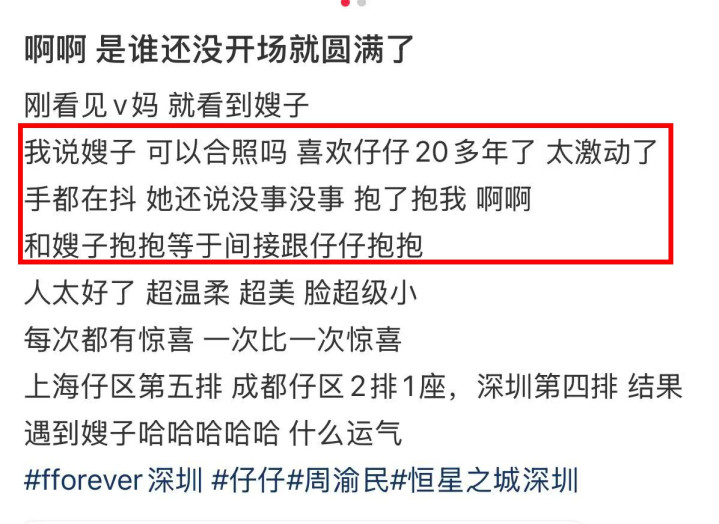 以致有粉丝挑升找周夫人喻虹渊合影,拍照时委果太豪放,手王人发抖了,周夫人极度温煦,抱着粉丝劝慰她“没事没事”。