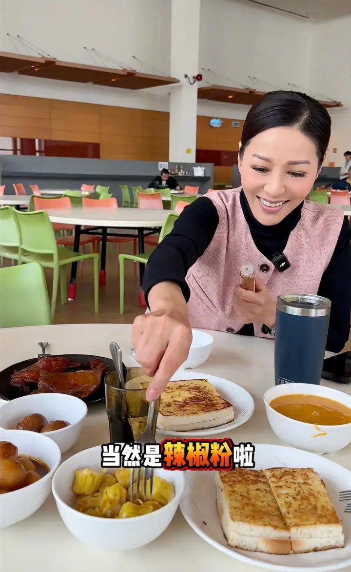 此外滕丽名还点了鱼蛋、烧卖和鸡腿,特别丰富。因为点了太多食品,阿滕只好一手拿一个餐盘,开餐前拿出私伙辣椒粉调味,还说比拟健康。