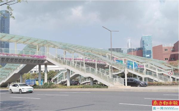线条利落的结构、通透的玻璃雨棚、盛放的三角梅交集点缀……单看外不雅,这座横跨泥岗西路的东说念主行天桥,与邻近干净整洁的说念路环境井水不犯河水,变成显著对比,称得上是一座当代感皆备的城市景不雅天桥。