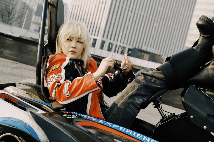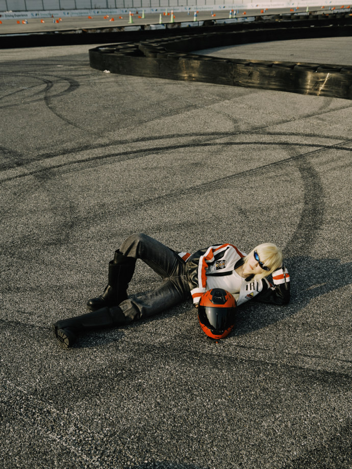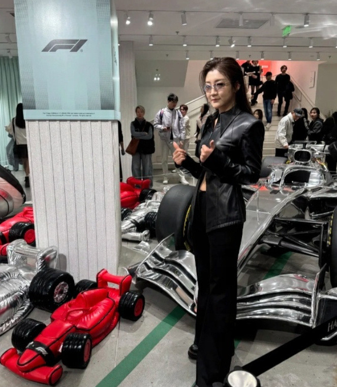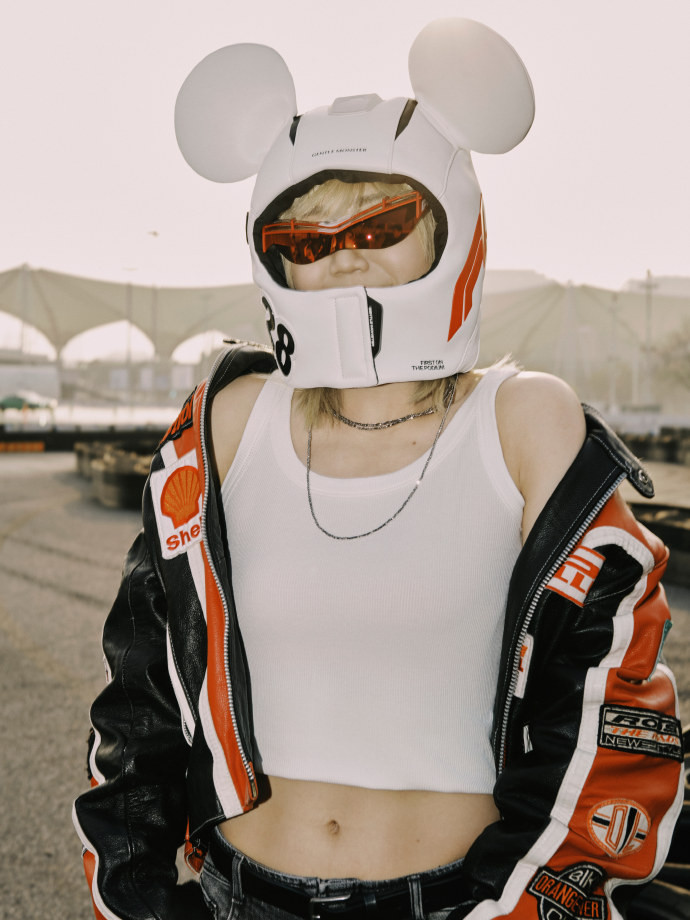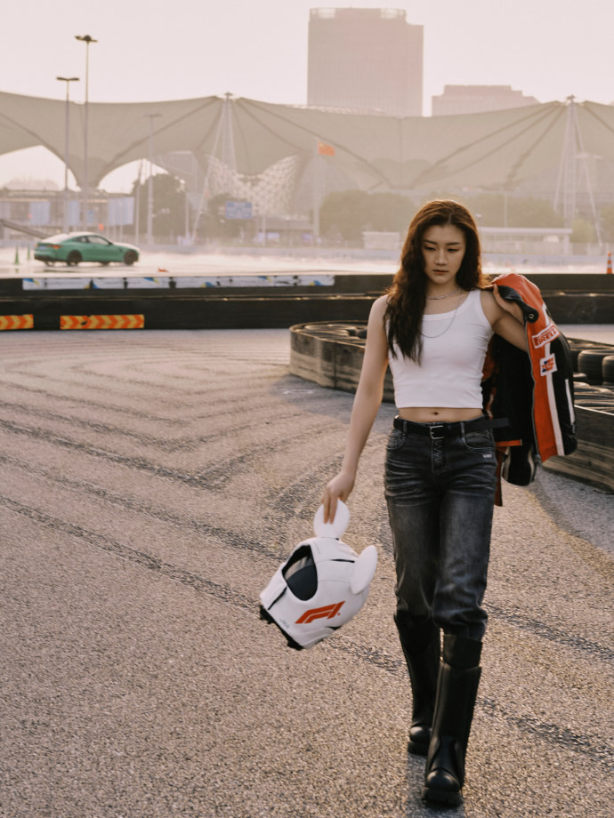 陈梦身穿剪裁利落的玄色皮衣,搭配干练短发与Gentle Monster × Disney × F1联名墨镜,举座造型冷冽凌厉。皮衣蓄意强化肩部线条,在赛说念轰鸣的配景中,长入动态热潮的发丝,完竣交融畅通员的力量感与前卫张力。