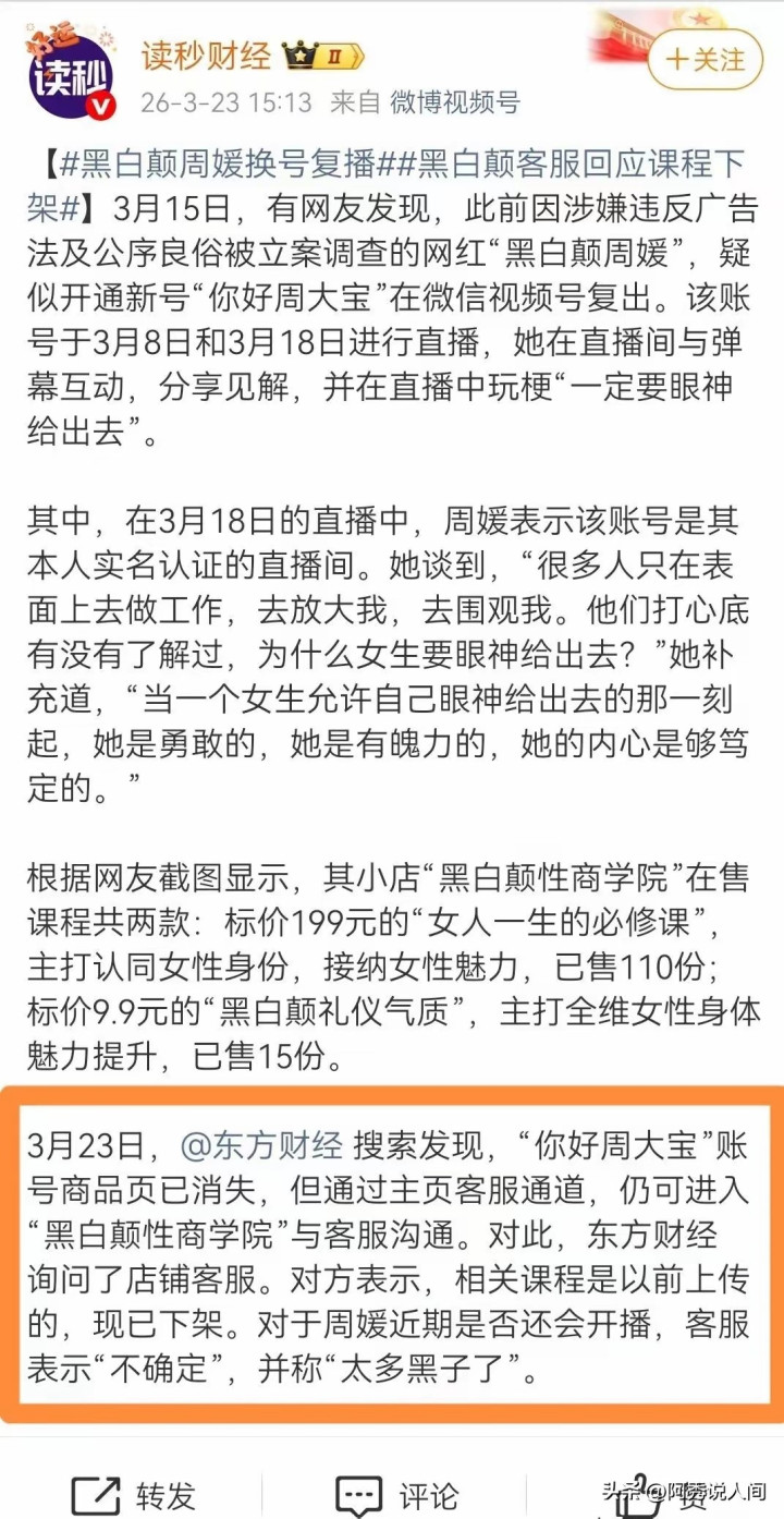 周媛最近又开动折腾了,之前在短视频教东谈主用办法勾引男东谈主,还让女学员摆X型姿势,被全网封号了。她当今换了名叫“周大宝”,在别家平台继续作念直播。直播里她不断念叨我方之前被冤枉,还说我方被动去农村喂过一个月猪。