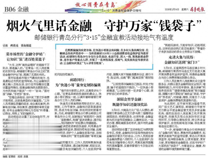 在骆驿继续的农贸商场,在快递小哥晨会的时弊,在乡村大集的摊位旁,在糖球会的欢声笑语中……为积极作念好2026年“3·15”金融破钞者权益保护宣传训诲行径,邮储银行青岛分行分支行全员挪动,走出厅堂,深化一线,聚焦新服务群体、老年客户等要点东说念主群,开展了一系列有温度、接地气、见实效的宣传训诲行径,让金融知识信得过“飞入寻常庶民家”。