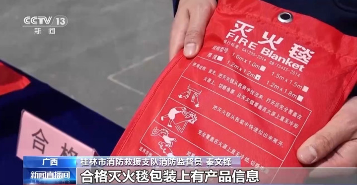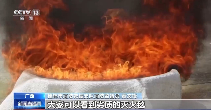 桂林市消防营救支队消防监督员秦文锋:劣质的熄灭毯盖在油盘上被烧穿了,够不上熄灭的效率。