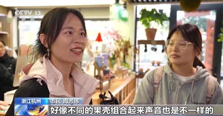 市民周芳伟:好像不同的果壳组合起来声息亦然不不异的,有些像溪流。还有相比柔软的声息,挂在包上照旧挺好的。